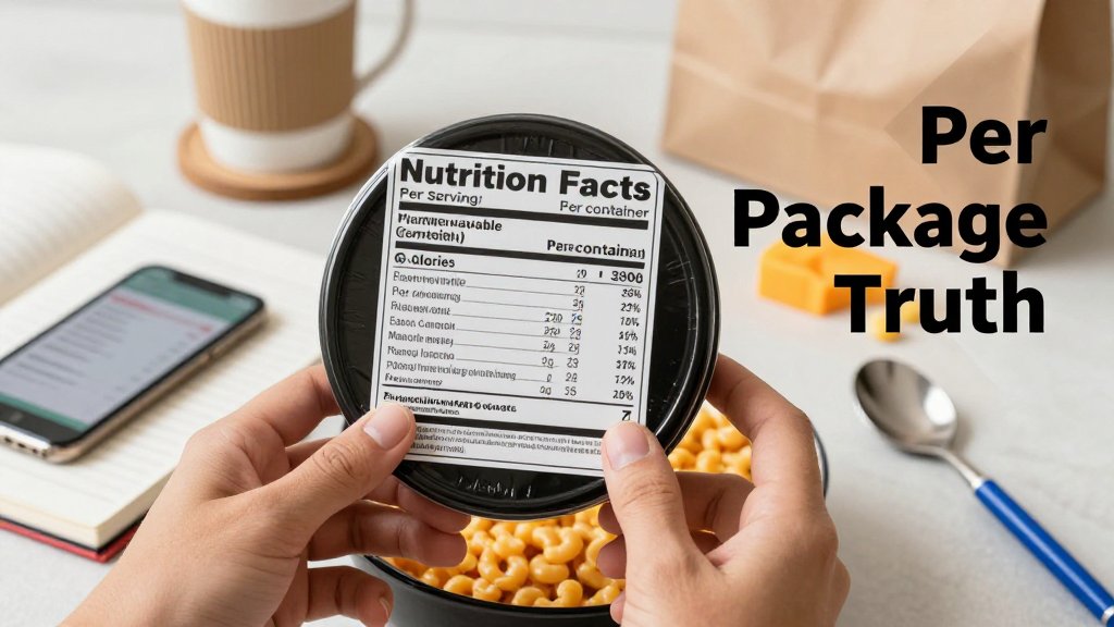 Use this no-math shortcut and you will be right most of the time. Step 1: look at the serving size (both the household measure and the grams). Step 2: look at servings per container, then decide what fraction you actually ate, like all, half, or shared. Step 3: use the column that matches your fraction. If you ate it all, use the per package column. If you ate half, use per serving if one serving truly equals half the package, or log 0.5 package in your tracker. The most common trap is assuming “one package” equals “one serving,” especially with bowls, bottles, and snack-size bags.