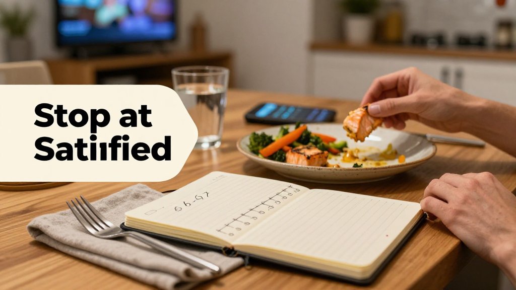 You do not need a food scale to stop at satisfied, you need a simple stopping plan. Combine two tools: a visual plate template and your hunger scale check-in. Start by building your plate in rough “quarters,” then let 6 to 7 on the satiety scale be your finish line. A practical default for most lunches and dinners is this: half non-starchy plants (salad, broccoli, peppers, berries), one quarter protein (chicken, tofu, Greek yogurt), and one quarter carbs (rice, pasta, potatoes), which matches the idea behind the USDA MyPlate plate guide. From there, hunger decides how much of that plate you actually eat today.